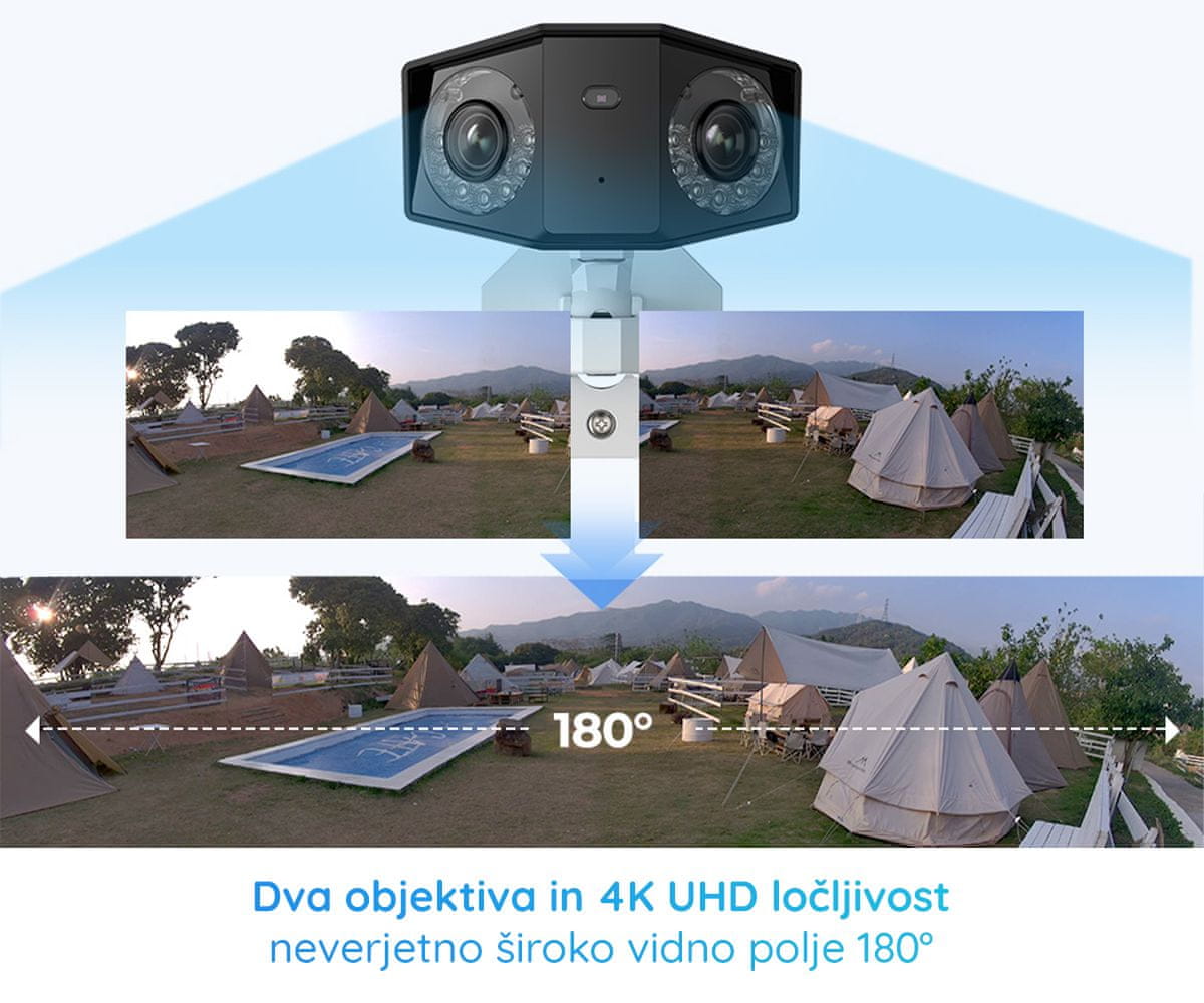 IP kamera Reolink Duo 2 PoE je zasnovana za zagotavljanje varnosti za vaš dom. Ta kamera je opremljena z dvema objektivoma in vam omogoča 180° širok kot snemanja. Z ločljivostjo 4K Ultra HD snema video z večjo jasnostjo, zahvaljujoč LED reflektorjem in IR LED lučem pa zajema barvne posnetke tudi ponoči. Dodatno je nameščena tehnologija za zaznavanje oseb / vozil / živali. Vgrajena ima tudi zvočnik in mikrofon za enostavno dvosmerno komunikacijo. Druge funkcije, ki jih ponuja Duo 2 PoE so: žično PoE povezovanje in napajanje preko enega kabla, IP66 vodoodpornost, brezplačna aplikacija in različne možnosti shranjevanja posnetkov. Celoten opis