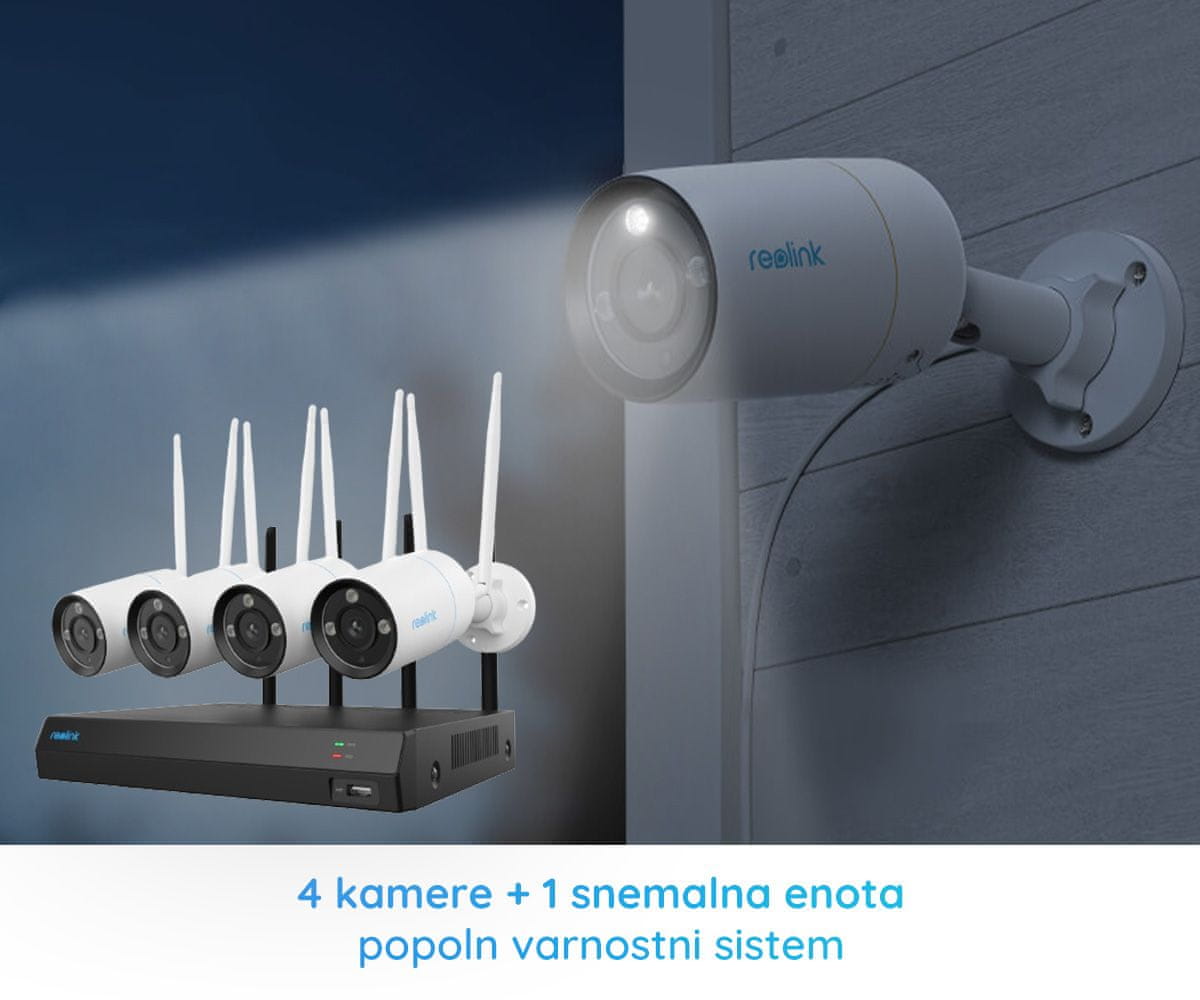Set v pakiranju vključuje 4 kamere W330C, 1 snemalno enoto NVS12, ter vse potrebne dodatke in kable za hitro namestitev. Na snemalno enoto lahko povežete do 12 kamer Reolink.