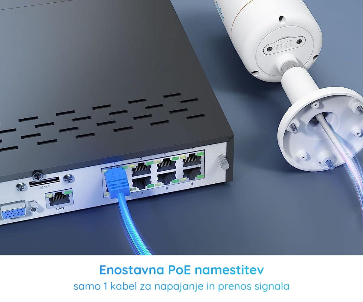 - PoE namestitev – napajanje kamere in prenos videa preko enega kabla.