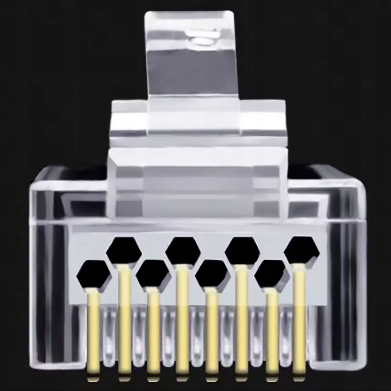 Profesjonalne przelotowe wtyki RJ45 kat. 6e w ilości 100 sztuk – idealne do samodzielnego zaciskania przewodów typu skrętka UTP. Wersja 8P8C (8 pinów, 8 kontaktów) zapewnia pełną zgodność z okablowaniem sieciowym typu Ethernet.