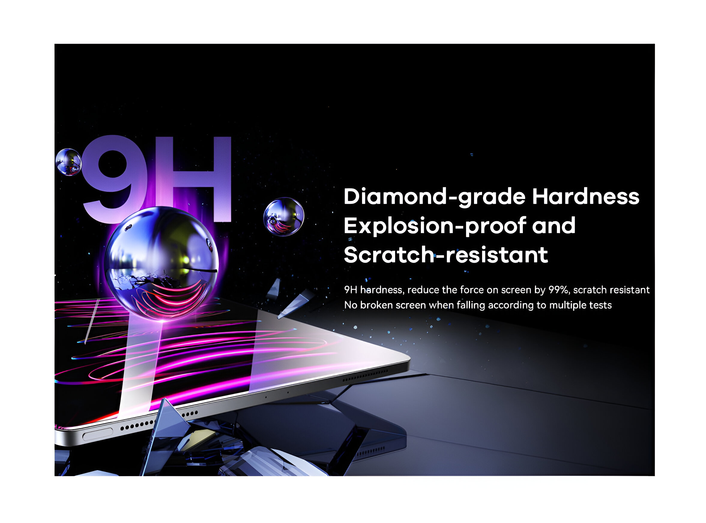 Trdota 9H pomeni, da je steklo bolj odporno na praske in mehanske poškodbe v primerjavi z drugimi stekli. Lestvica trdote 9H ustreza trdoti kristala. površina , ki zagotavlja visoko zaščito zaslona pred vsakodnevno obrabo. To pomeni, da so uporabniki lahko prepričani, da je njihov zaslon dobro zaščiten tudi v primeru stika z ostrimi predmeti.