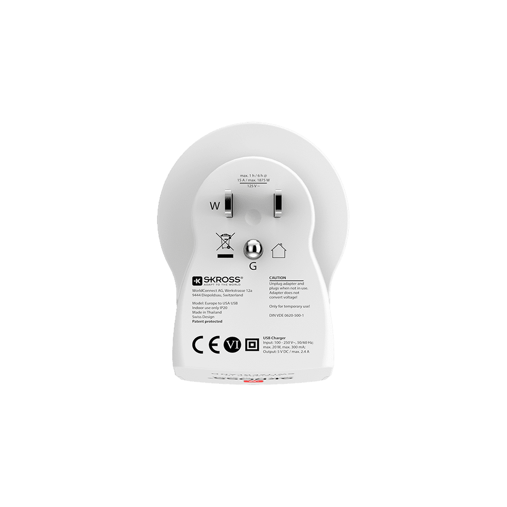 Ta adapter priznanega švicarskega podjetja SKROSS povezuje naprave s poljskimi vtiči z ZDA in 20 drugimi državami. Ta adapter vam omogoča, da svoje naprave s poljskim vtičem povežete z ZDA in 50 drugimi državami, ki uporabljajo ameriški standard. Adapter ima dvojni polnilnik USB, ki vam omogoča hkratno priključitev do treh naprav. Adapter ima vse potrebne varnostne certifikate, zato ste lahko prepričani, da ne bo poškodoval vašega telefona ali vašega najljubšega sušilnika za lase.