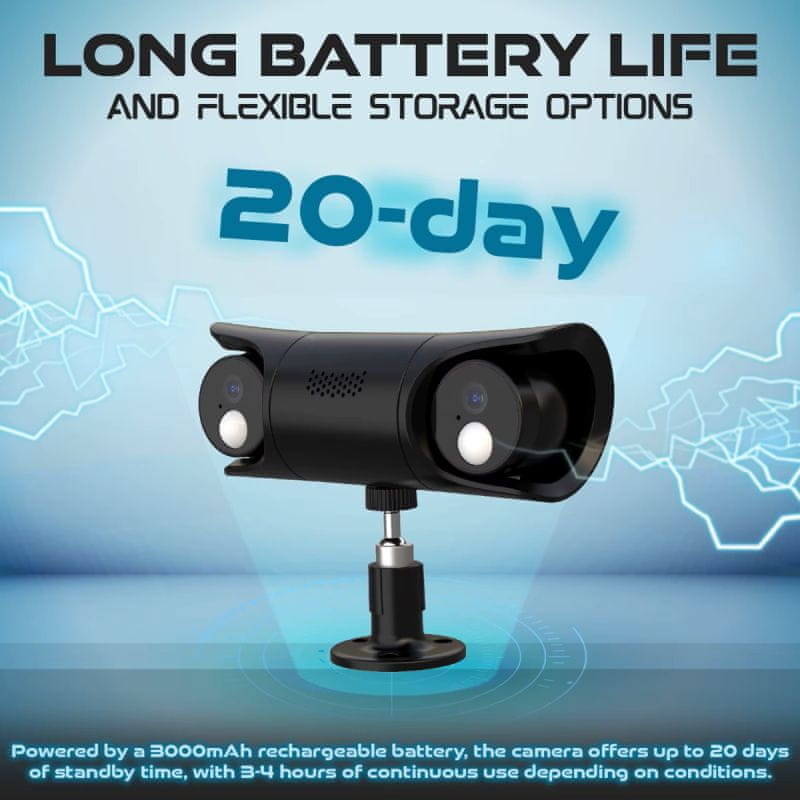 Z vgrajeno baterijo 3000 mAh kamera v stanju pripravljenosti deluje do 20 dni. Nočni vid z IR diodami zagotavlja jasno sliko tudi v popolni temi (do 10 m). Funkcija dvosmernega zvoka omogoča ne le spremljanje, temveč tudi komunikacijo v realnem času.