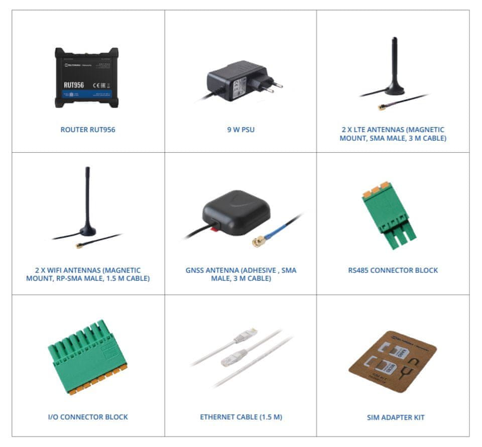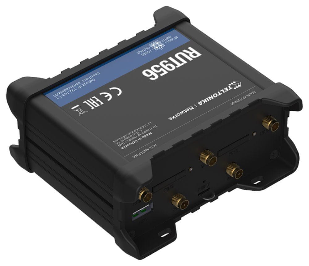RUT956 je zelo zanesljiv in varen usmerjevalnik LTE z vhodom/izhodom, GNSS in RS-232/RS-485 za profesionalne aplikacije. Usmerjevalnik zagotavlja visoko zmogljivost in funkcionalnost GPS za kritične mobilne komunikacije. Ima 4× RJ45, RS-485 (6pin), RS-232 (vtičnica DB9), USB-A, 5× antenski priključek (3× SMA, 2× RP-SMA), I/O vhod (10pin) in dve reži za kartice SIM, omogoča uporabo dveh različnih ponudnikov mobilnih storitev in vzpostavitev redundantnih povezav 4G/LTE ali 2G/3G s funkcijama Failover in Fallback.