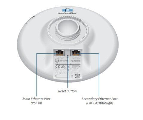 Zahvaljujoč tehnologiji AirMAX ac ima PoweBeam visoko odpornost na hrup iz okolice. Zmogljiv procesor MIPS 74Kc, ki ga dopolnjuje 64 MB pomnilnika, zagotavlja visoko prepustnost, ki glede na izbrano širino kanala in lokalne razmere doseže do 450 Mb/s+. V načinu P2P lahko izberete širino kanala 10/20/30/40/50/60/80 MHz, v načinu P2MP pa 10/20/30/40 MHz. Naprava je opremljena z enim 10/100/1000Mb/sethernetnim priključkom, prek katerega jo napaja priloženi 24V/0,5A Gbit POE adapter.