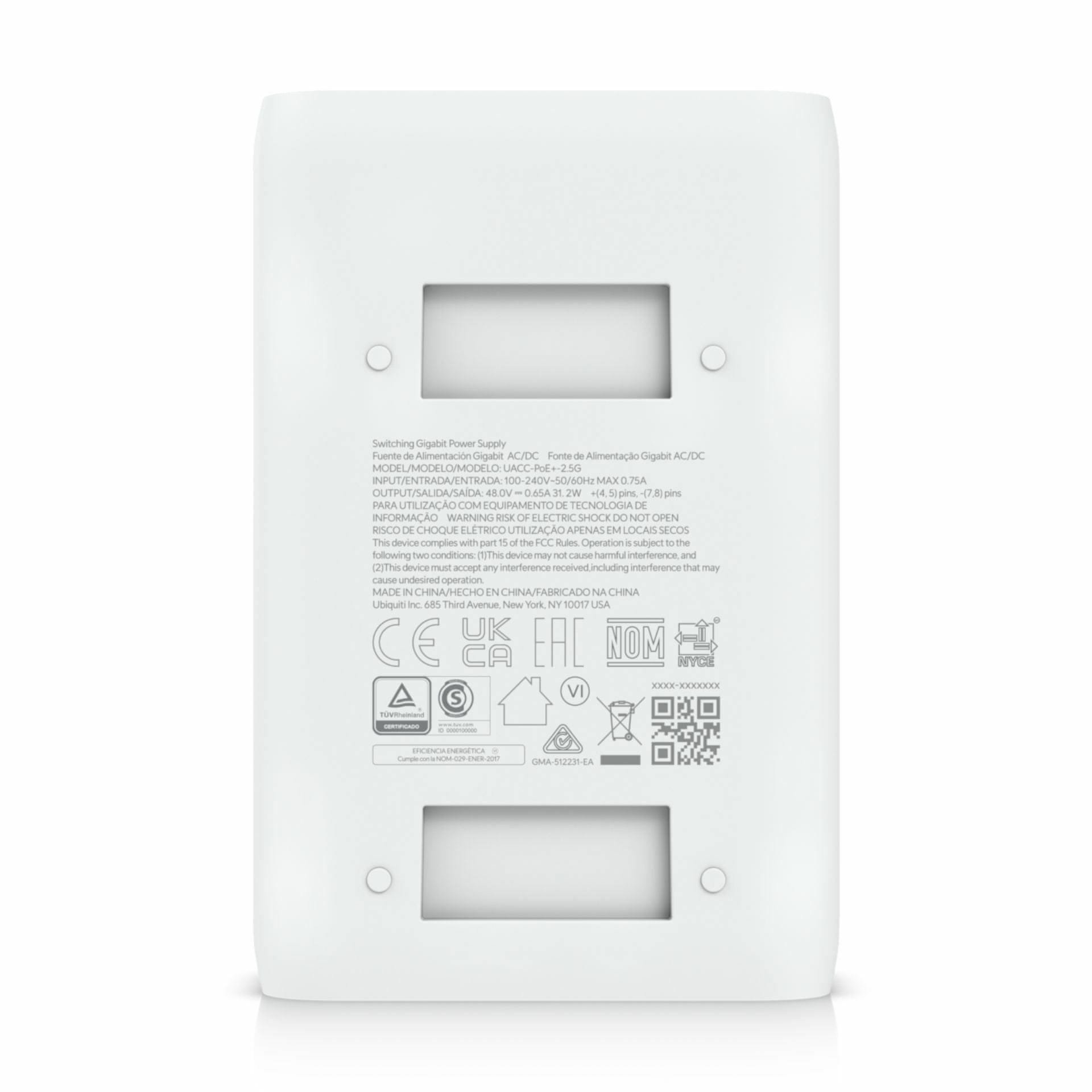 Ubiquiti UACC-PoE±2.5G (UniFi 2,5G PoE+ adapter 30W) je profesionalni PoE injektor, ki omogoča izhodno napetost 48V DC pri 0.65A in zagotavlja tako napajanje kot prenos podatkov s polno hitrostjo 2,5 Gb/s. Zmožnost zagotavljanja moči do 30 W ga naredi idealnega za napajanje naprav, kot so dostopne točke Wi-Fi 6E/7, PTZ kamere in omrežna stikala.