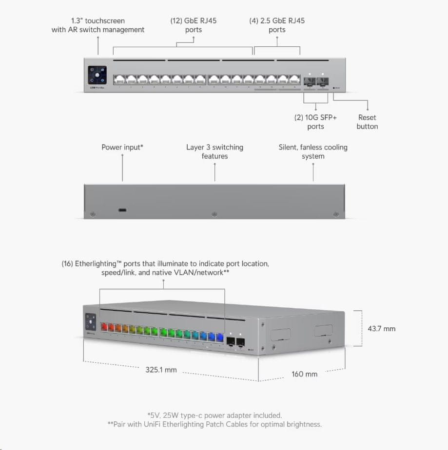 UniFi Pro Max 16 16-priključno stikalo 3. sloja Etherlighting z 2,5GbE