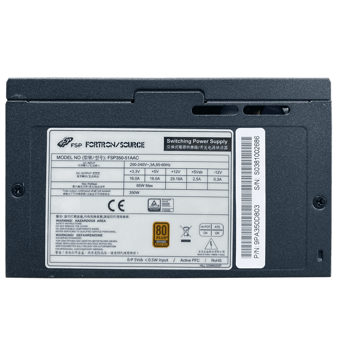 Napajalnik ATX Fortron FSP350–51AAC 85+ z močjo 350 W. Za dolgoročno zanesljivo delovanje je Fortron FSP350–51AAC 85+ opremljen s 120 mm ventilatorjem. Napajalnik lahko zaustavite z vgrajenim stikalom za napajanje.