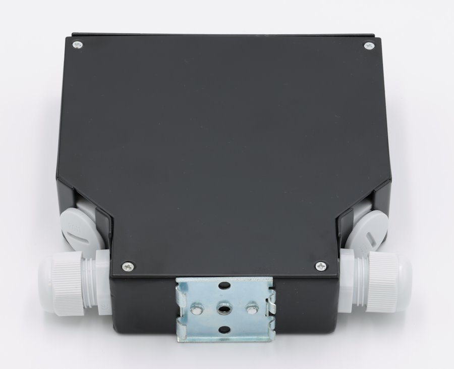 Majhna kovinska stikalna plošča za montažo na DIN tirnico. Omogoča namestitev adapterja 8× SC simplex. Robustna kovinska zasnova, 4× vhod (2× zaslonka + 2× PG11). Kabla ni treba navijati, lahko ga celo samo položite.