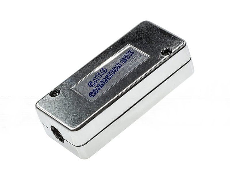Priključna škatla Cat6, zaščitena s pokovko. Omogoča povezovanje segmentov kabla brez izgube kakovosti kabla. Udarni kontakti.