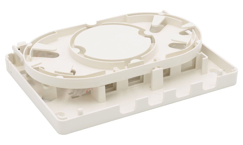 Optična stenska vtičnica, primerna za 4 adapterje formata SC ali LC. Navijalna tuljava za zaključek v obliki copata.