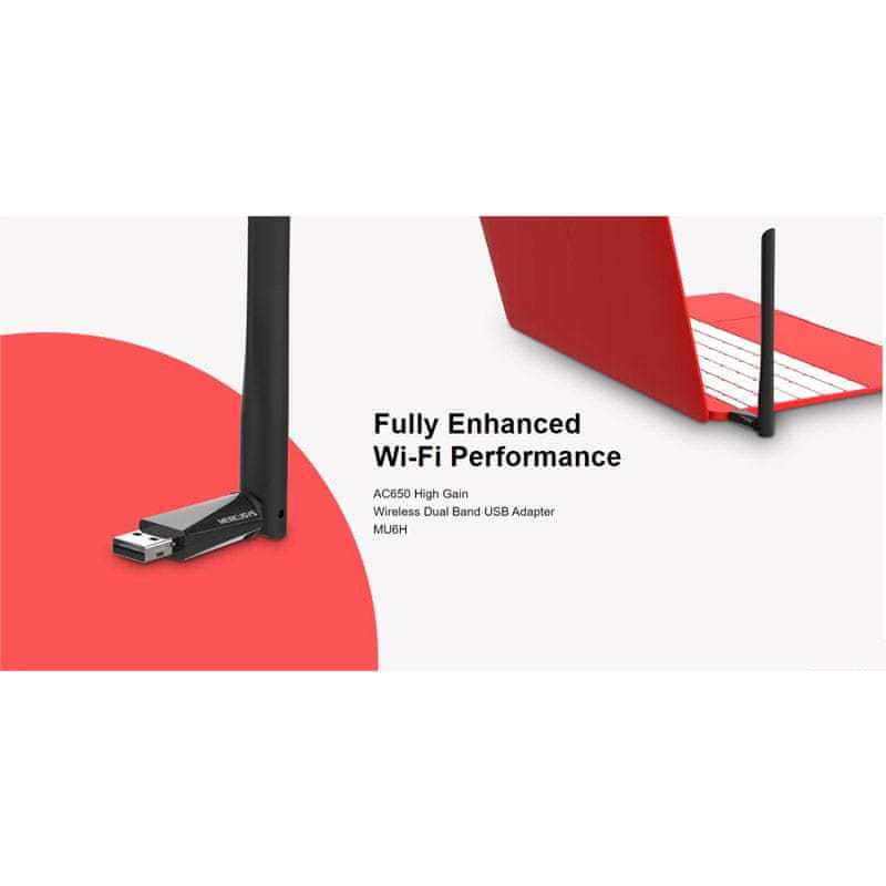 MERCUSYS AC650 (MU6H) Dual Band USB brezžični adapter sprejema brezžične signale v dveh ločenih pasovih. Podpora 256-QAM poveča hitrost prenosa 2,4 GHz s 150 Mbps na 200 Mbps. Uživajte v hitrostih do 200 Mbps v pasu 2,4 GHz in 433 Mbps v pasu 5 GHz, da v celoti izkoristite vašo brezžično povezavo. Izberite 2,4 GHz frekvenco za brskanje ter 5 GHz frekvenco do 433 Mbps za pretakanje HD vsebin in igranje brez zaostajanja. Pametna in enostavna namestitev za operacijski sistem Windows (10 / 8.1 / 8/7 / XP). Adapter le priključite v računalnik in sledite navodilom na zaslonu. 5 dBi antena močno poveča moč sprejema in prenosa USB adapterja. Prilagodljivo, večsmerno anteno lahko vrtite v več smereh, da izboljšate uporabniško izkušnjo in zmogljivost v različnih okoljih.