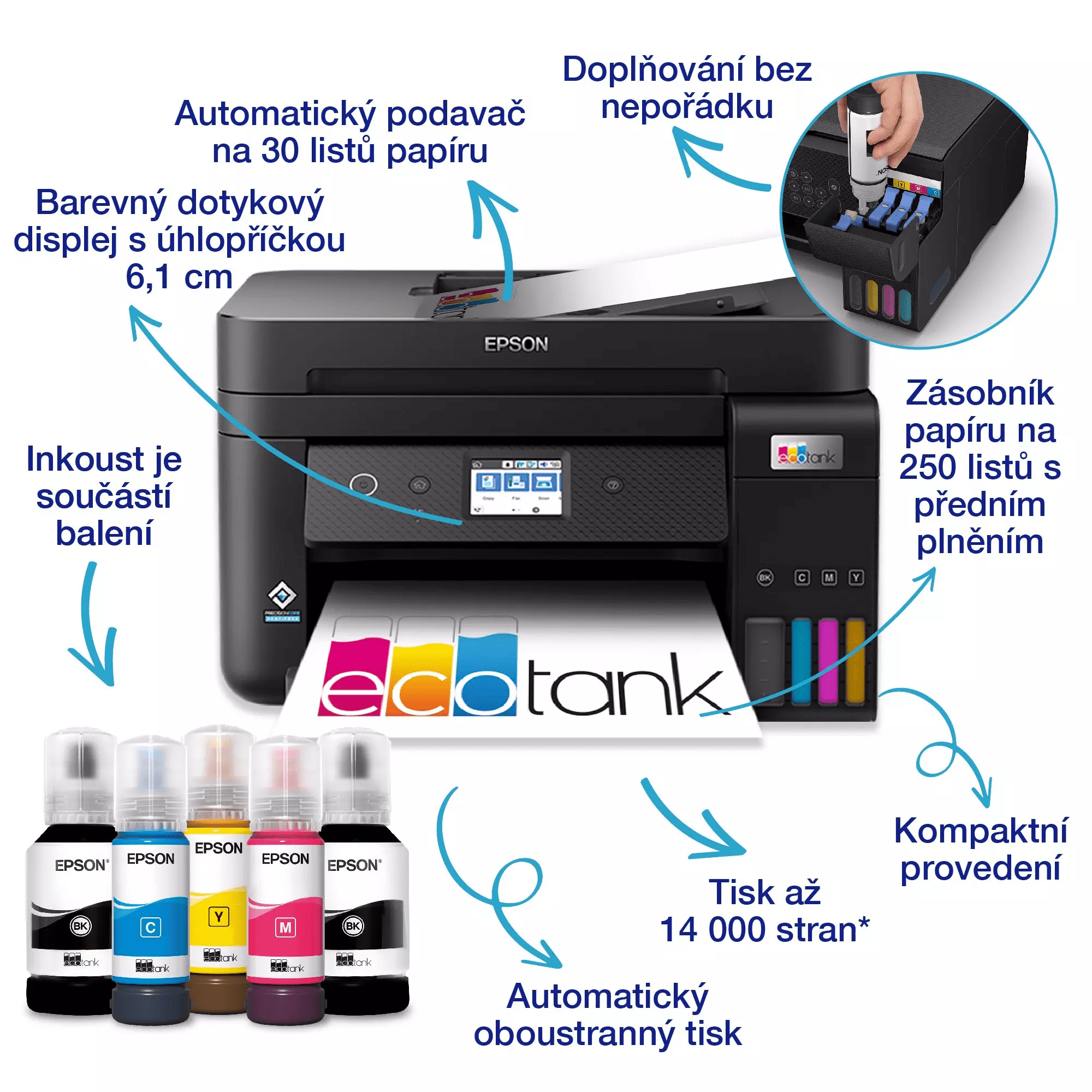 Epson pri tem modelu uporablja dolivanje neposredno iz stekleničk. Vsaka barva ima svoj zaklepni mehanizem, da ne pride do napačnega dolivanja. Polnjenje je enostavno in čisto. V paketu so tri 70 ml stekleničke barvnega črnila in dve 127 ml steklenički črnega. Ta serija naj bi zadostovala za do 3 leta tiskanja.
