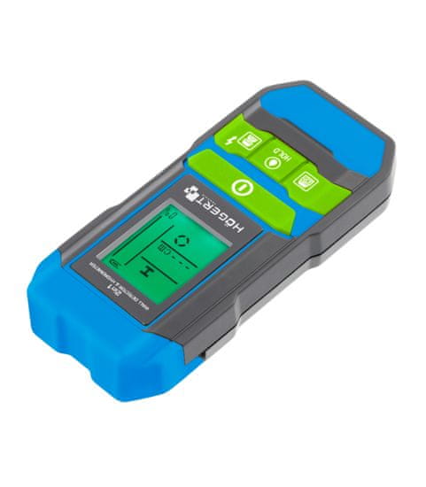 Značilnosti • zazna kable pod napetostjo max. 50 mm; • zazna feromagnetne kovine max. 60 mm; • zaznavanje barvnih kovin max. 50 mm; • zazna lesene konstrukcijske elemente max. 38 mm; • vgrajen higrometer za merjenje vlažnosti lesa in gradbenih materialov v razponu: les 5–50% in gradbeni material 1,5–33%; • enostaven za uporabo; • vizualni in zvočni alarm za zaznavanje kabla; • h zloraba zaščite pred mehanskimi poškodbami; • udobna, ergonomska, kompaktna oblika omogoča udobno upravljanje z eno roko; • napaja 2×1,5 V AAA baterija, daljša življenjska doba baterije zahvaljujoč samodejnemu izklopu. • 113 g