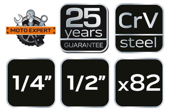 Komplet nasadnih ključev NEO 1/2" in 1/4" (ref. št. 10–059) je sestavljen iz 82 kosov iz visokokakovostnega krom-vanadijevega jekla. V kompletu so raglje 1/2" in 1/4" (vzdržljiv mehanizem raglje – 90 zob) z ukrivljenimi, ergonomskimi ročaji. V kompletu je bogat nabor šesterokotnih ključev z vtisnjenimi napisi (velikosti od 4 do 32 mm) in nastavki za izvijač (ploščati, križni, šesterokotni, Torx). Dodatno so v kovčku viličasti ključi (9 kosov, 8mm – 22mm). Celoto dopolnjuje širok nabor dodatkov. Navpična postavitev predmetov v kovčku omogoča hitrejšo sestavo potrebnega kompleta. Ključi so dobavljeni v praktični in robustni plastični škatli s kovinskimi zapahi in priročnim ročajem. Zanesljivost izdelka potrjujeta 25-letna garancija in certifikat TÜV Rheinland M+T. Blagovna znamka NEO izpolnjuje pričakovanja profesionalcev.