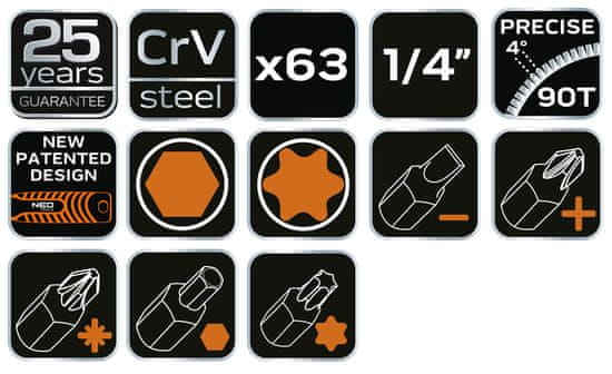 63-delni komplet ključev 10–008 NEO je profesionalni komplet nasadnih ključev ¼” v priročnem kovinskem kovčku z vtisnjenim logotipom. Komplet orodja je sestavljen iz 63 visokokakovostnih elementov iz krom-vanadijevega jekla, ki spadajo v kategorijo MOTO Base – delavnica. V kompletu je ¼” raglja z 90 zobmi in poševnim ročajem za lažje delo na težko dostopnih mestih. V ohišju so tudi nastavki šesterokotne velikosti od 4 do 14 mm, v kratki in dolgi izvedbi ter nastavki tipa E, prilagojeni za delo z vijaki TORX. V kompletu so na voljo tudi nastavki, ki so nameščeni na nastavkih, kar zagotavlja udobno uporabo, ter dodatki – 4 podaljški, T-ročaj, zglob, ¼” ročaj za izvijač in adapter za izvijač. Kovček ima praktičen vložek iz gobe, ki preprečuje premikanje orodja. Visoko kakovost seta potrjujeta 25-letna garancija in mednarodni TÜV certifikat.