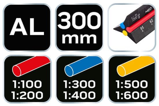 Trikotno ravnilo NEO (ref. št. 72–205), dolžine 30 cm, ima barvne markerje iz PVC-ja. Izdelano iz visokokakovostnega eloksiranega aluminija, stranice ravnila so barvno označene glede na merilo za enostavno izbiro želenega merila: rdeča – merilo 1:100; 1:200, modro merilo: 1:300; 1:400, rumena – merilo 1:500; 1:600.