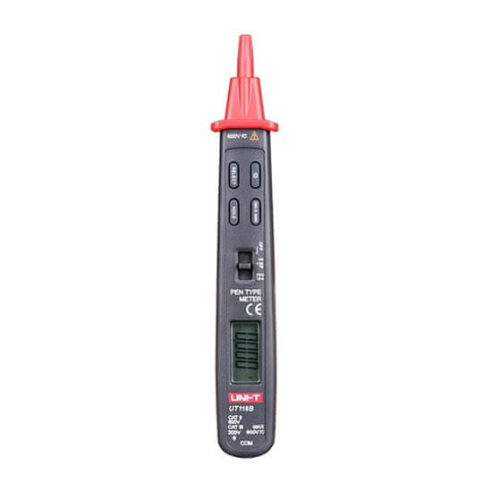 UT118B ponuja lahko berljiv zaslon LCD velikosti 28 × 14 mm, ki omogoča enostavno branje rezultatov tudi v slabših svetlobnih pogojih. Funkcija „data hold“ vam omogoča, da zadržite odčitek na zaslonu, načini MAX/MIN pa vam omogočajo spremljanje vrednosti v realnem času. Poleg tega se naprava samodejno izklopi po približno 10 minutah neaktivnosti, da se prepreči nepotrebno praznjenje baterije. Vgrajeni indikator prazne baterije vas opomni, kdaj je treba zamenjati baterijo.