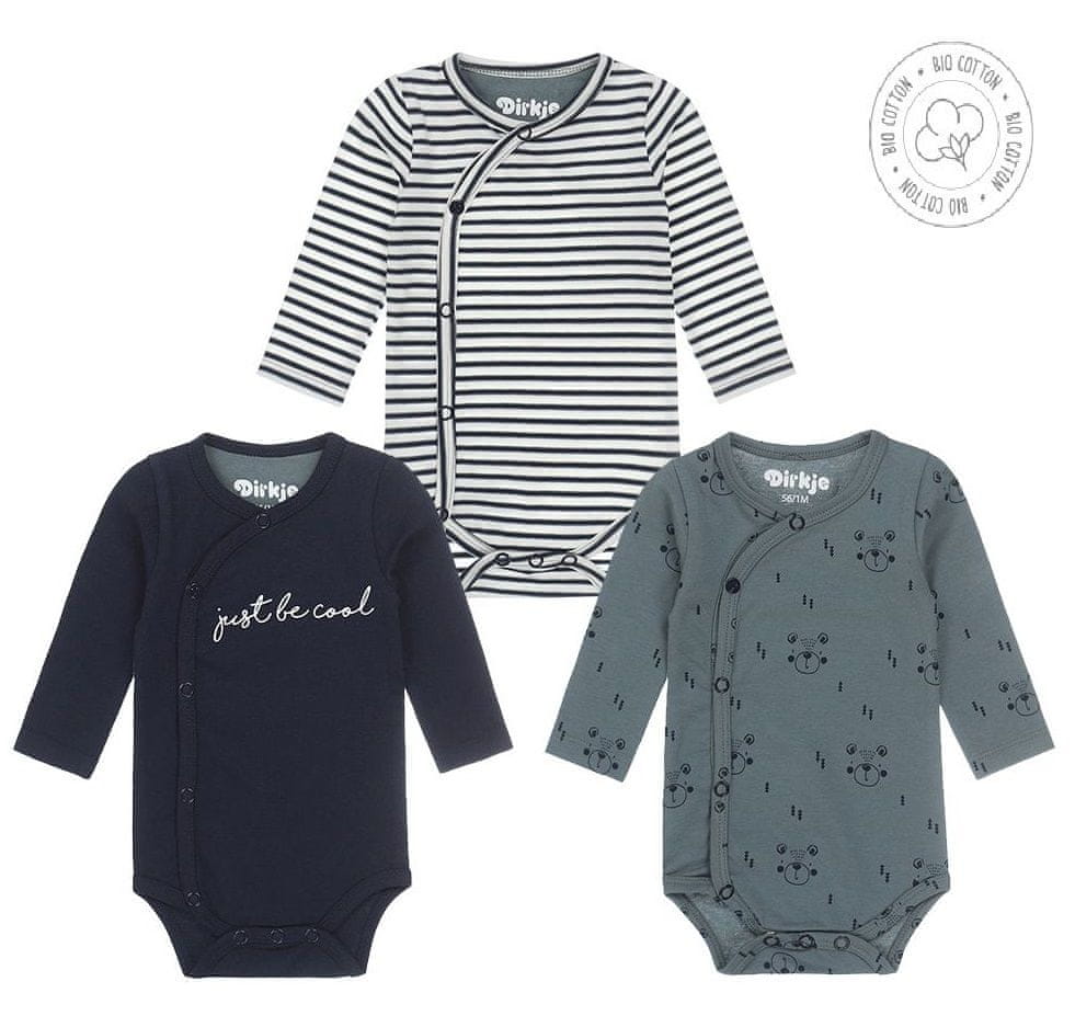 Komplet treh bodijev z dolgimi rokavi v modri in beli barvi, zapenjanje v mednožju z breznikljastimi pritiskači.Izdelani so iz mehke in prijetne bombažne tkanine, prijazne do občutljive otroške kože.Klasični, zračni in udobni bodiji, primerni za vsakodnevno uporabo in posebne priložnosti.Imajo certi