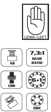 Levi ročaj : Ta multiplikator, ki je na voljo z ročajem na levi strani telesa, zagotavlja udobno uporabo za več ur aktivnega vrtenja, tudi s težkimi vabami.
