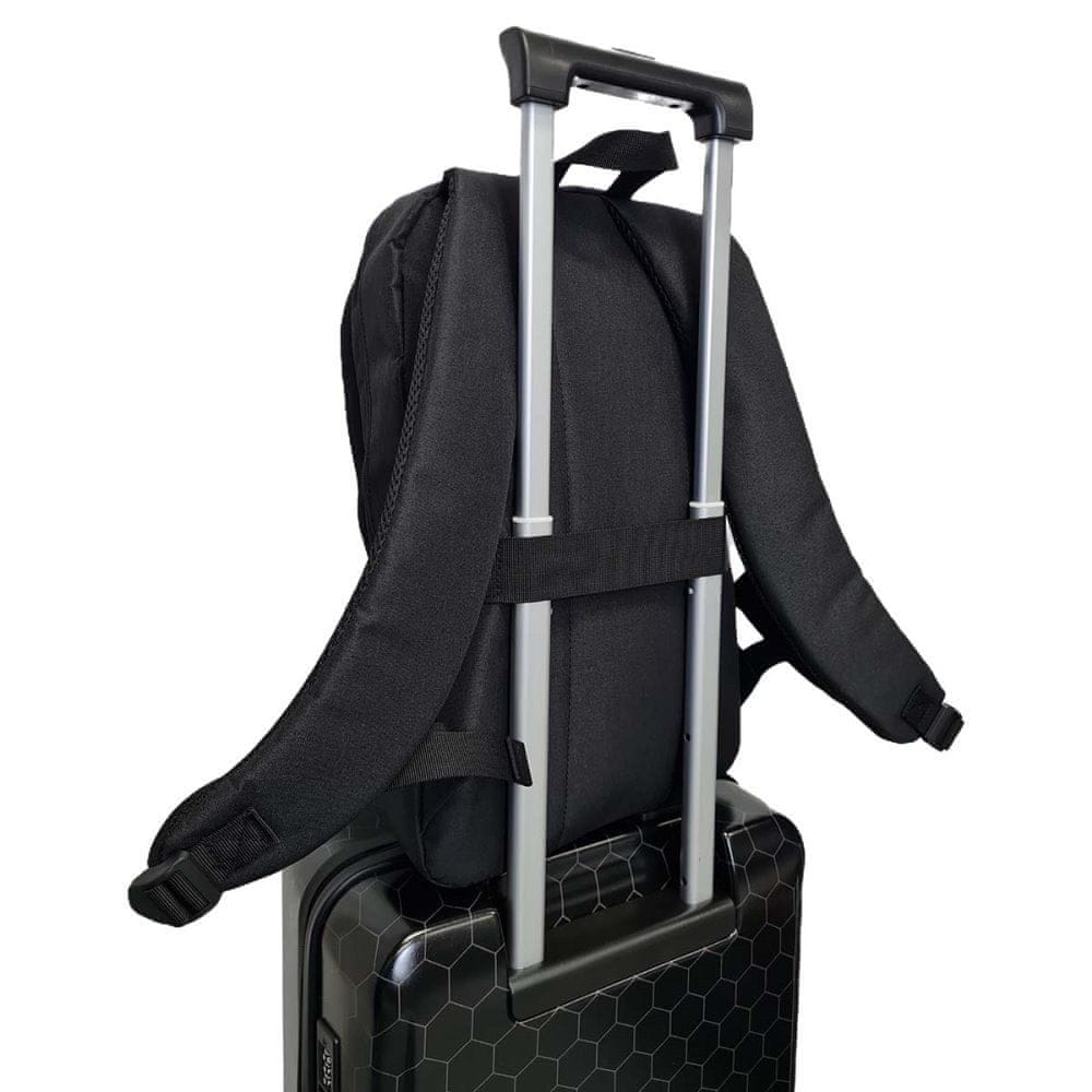 Nahrbtnik za prenosni računalnik do 16" ponuja predvsem praktičnost in udobje na potovanjih. Deset predelkov ponuja veliko prostora za vaše naprave in dodatke. Na voljo so poseben oblazinjen predel za prenosni računalnik, velik glavni predel za shranjevanje polnilnika, slušalk ali drugih obsežnih predmetov, notranji žep za denarnico z zadrgo, organizator za dodatke, sprednji žep s hitrim dostopom za denarnico ali pisala ali majhen sprednji žep za hiter dostop do telefona. Nahrbtnik ima tudi trak za pritrditev na prtljago med potovanjem.