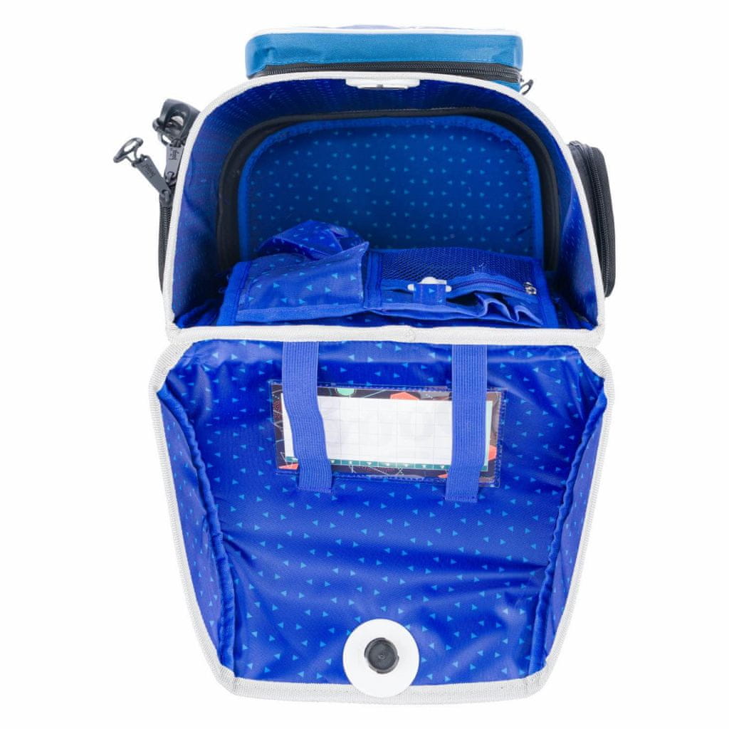 – V notranjosti aktovke je prozoren žep z urnikom in notranjim organizatorjem, ki omogoča enakomerno porazdelitev teže.
