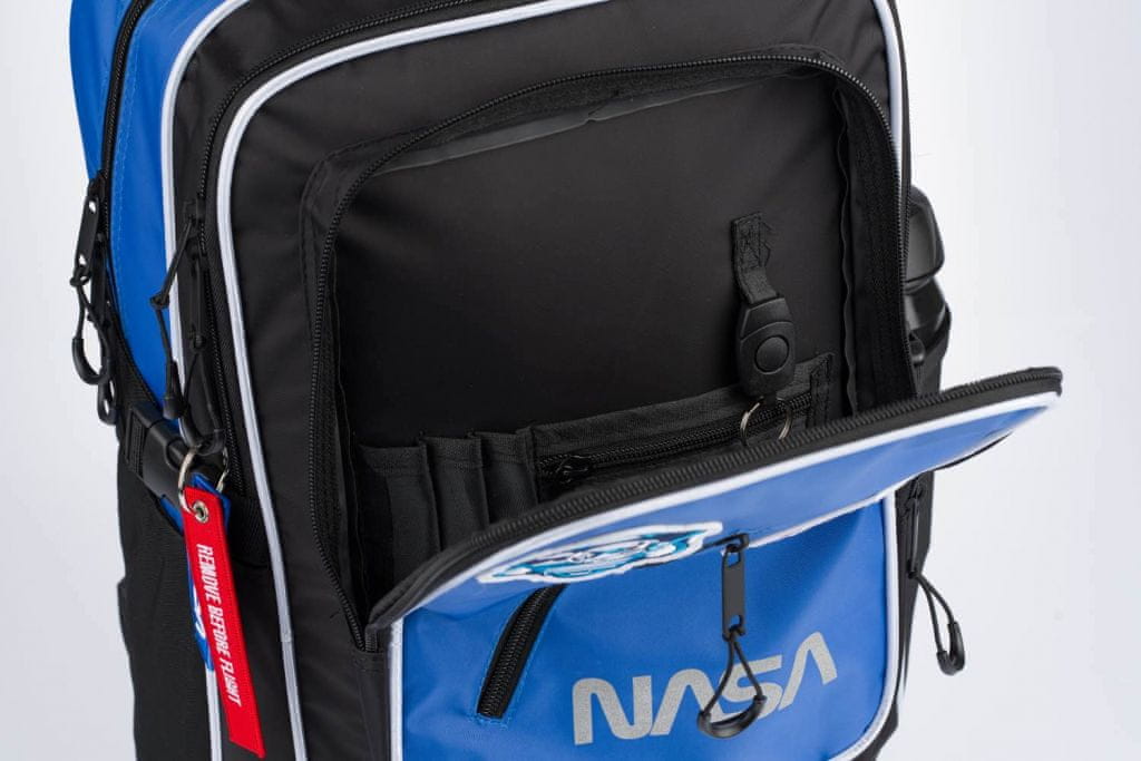 – V sprednjem predelu nahrbtnika je praktičen organizator in zanka s karabinom za obešanje ključev. To karabinko je mogoče ločiti in uporabljati ločeno.