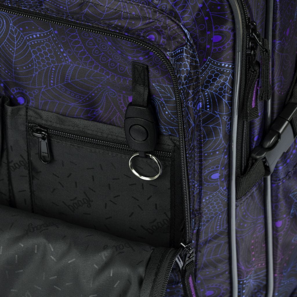– Sprednji predel nahrbtnika vsebuje praktičen organizator ter zanko s karabinom za obešanje ključev. To karabinko je mogoče sneti in uporabljati ločeno.