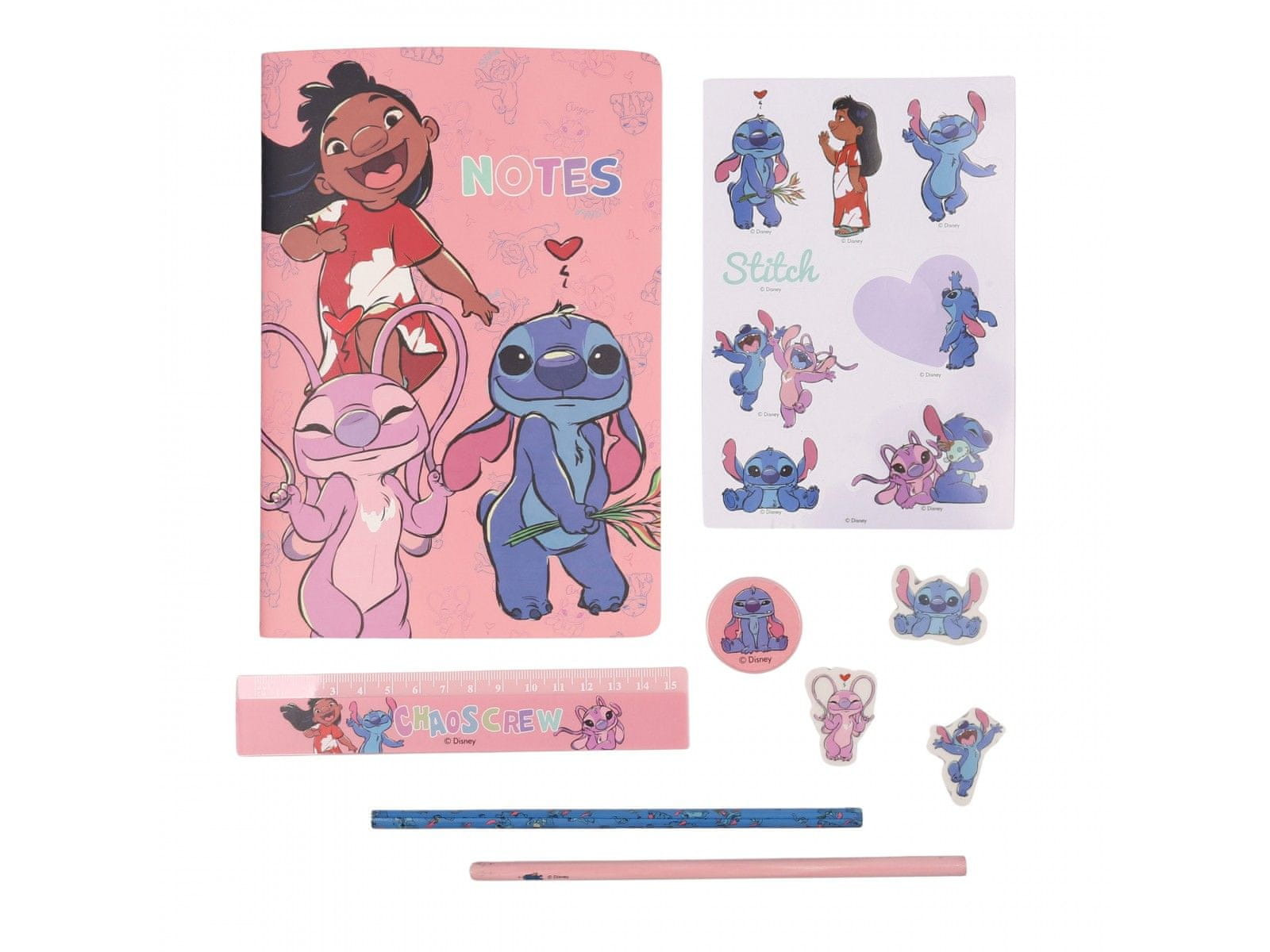 Set vsebuje različne dodatke: beležko, nalepke, ravnilo, šilček, tri radirke in dva svinčnika, kar ga naredi idealnega za igro in učenje.