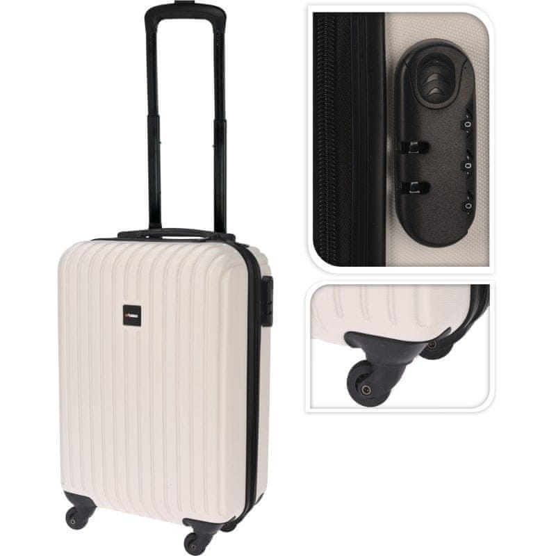 • trpežna kabinska prtljaga s štirimi kolesi – material: Ključavničar: visokokakovosten, vodoodporen, močan material z dobro odpornostjo proti praskam – teleskopski ročaj – na vrhu tudi zložljiv ročaj za ročno prenašanje – glavni veliki žep z dvosmerno zadrgo s ključavnico<br