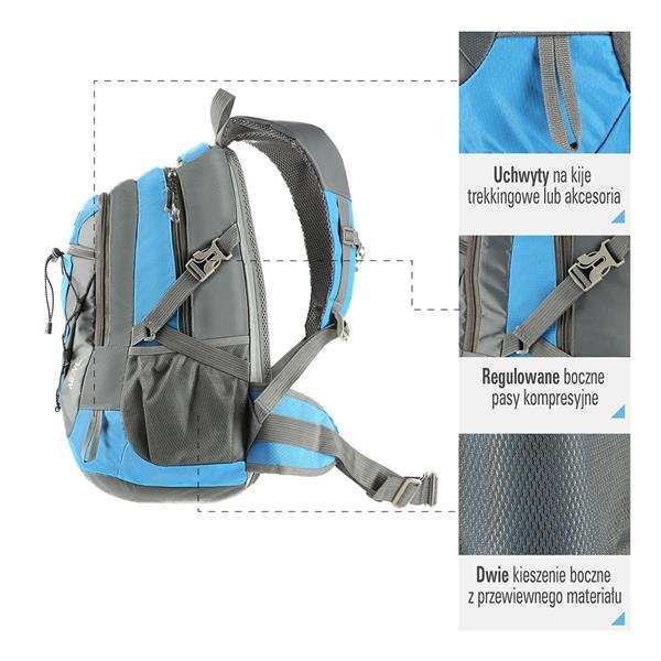 Nahrbtnik je opremljen s pasom za boke in prsnim pasom, ki zmanjšuje pritisk na našo hrbtenico, kar močno izboljša udobje in zmanjša pojav nelagodja v hrbtu. Poleg tega je model ABOVE opremljen s stranskimi kompresijskimi trakovi, tako da lahko zmanjšamo ali povečamo zmogljivost nahrbtnika