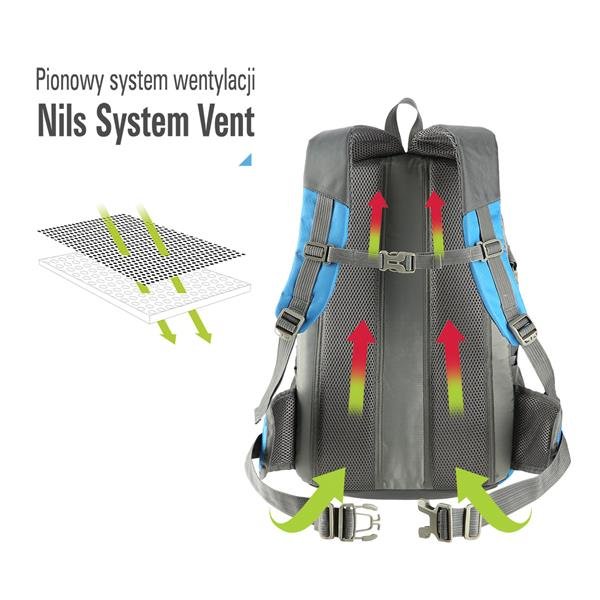 Za sistem Nils Vent boste z dolgimi pohodi brez težav. Hrbtna plošča, naramnice in ledveni pas so podloženi s posebno mrežo, tako da telo ni v neposrednem stiku z materialom, kar pozitivno vpliva na pravilno cirkulacijo in preprečuje potenje