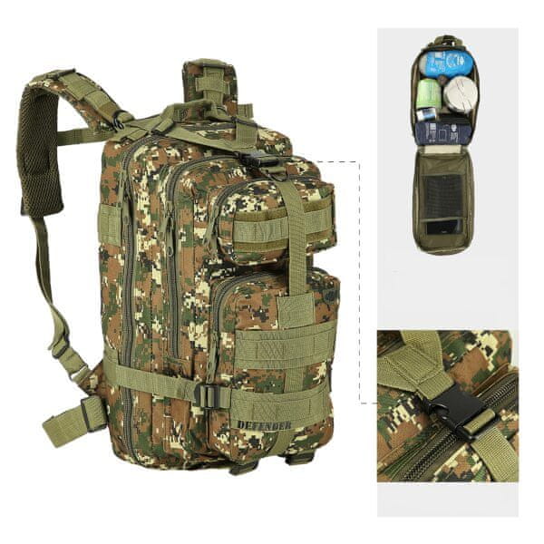 Material, iz katerega je izdelan nahrbtnik Defender, je izredno trpežen najlon, ki je odporen na dež in vodo do globine vodnega stolpca 1000 mm.