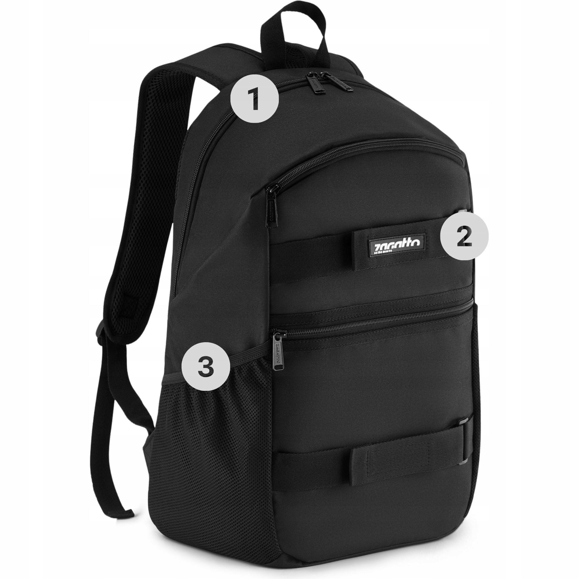 Veliki moški nahrbtnik Zagatto, športni, šolski črn ZG917. Zagatto velik nahrbtnik s prostorom za rolko. Če iščete funkcionalen nahrbtnik, ki združuje športni stil s praktičnimi funkcijami, je ta model s prostorom za rolko kot nalašč za vas. S čvrstimi ročaji in prostornim predalom boste pripravljeni na vsako avanturo, ne glede na to, ali se odpravljate v šolo, na trening ali v mesto. Zakaj izbrati ta model? Namenski prostor za prenosnik – predal sprejme prenosnik z zaslonom do 17". Vodoodporen material. Posebni elastični trakovi, ki omogočajo prenašanje rolke. Prostoren predal in pet žepov za vaše najnujnejše stvari. Nastavljive naramnice. Podložene! To zagotavlja dodatno zaščito in bo trajalo dlje. Naramnice in hrbtišče so iz pene in zračne mrežice – udobno je nositi tudi več ur! Izdelan je iz materialov, odpornih na poškodbe in umazanijo – poliestra in najlona. Lastnosti izdelka: aviator Model: zg917 Material: najlon in poliester Barva: črna Barva zadrge: 1 Število žepov: 5 Naramnice: s peno in zračno mrežico; nastavljive, s sponkami Zapenjanje: zadrga 46 cm Širina: 18 cm Zelo prostoren Nahrbtnik ima prostoren predal z zadrgo, idealen za naramnice. Naramnice na tem izdelku so nastavljive nahrbtnik po vaših željah. Poleg tega so ramenski trakovi in zadnji del nahrbtnika izdelani iz mehke pene z dihajočimi mrežicami! Športni videz. Črni, kakovostni materiali in športni logotip naredijo ta nahrbtnik odlično! Njegov sodobni dizajn odlično dopolnjuje urbani slog, kar poudarja vašo dejavnost in strast do športa. Blagovna znamka. Nahrbtnik vsebuje gravirane pulke in nabor nalepk. Vremensko odporen. To smo preizkusili Polili smo ga z vodo, da bi videli, kako se obnese na dežju. Na fotografiji so kapljice, ki tečejo po materialu.