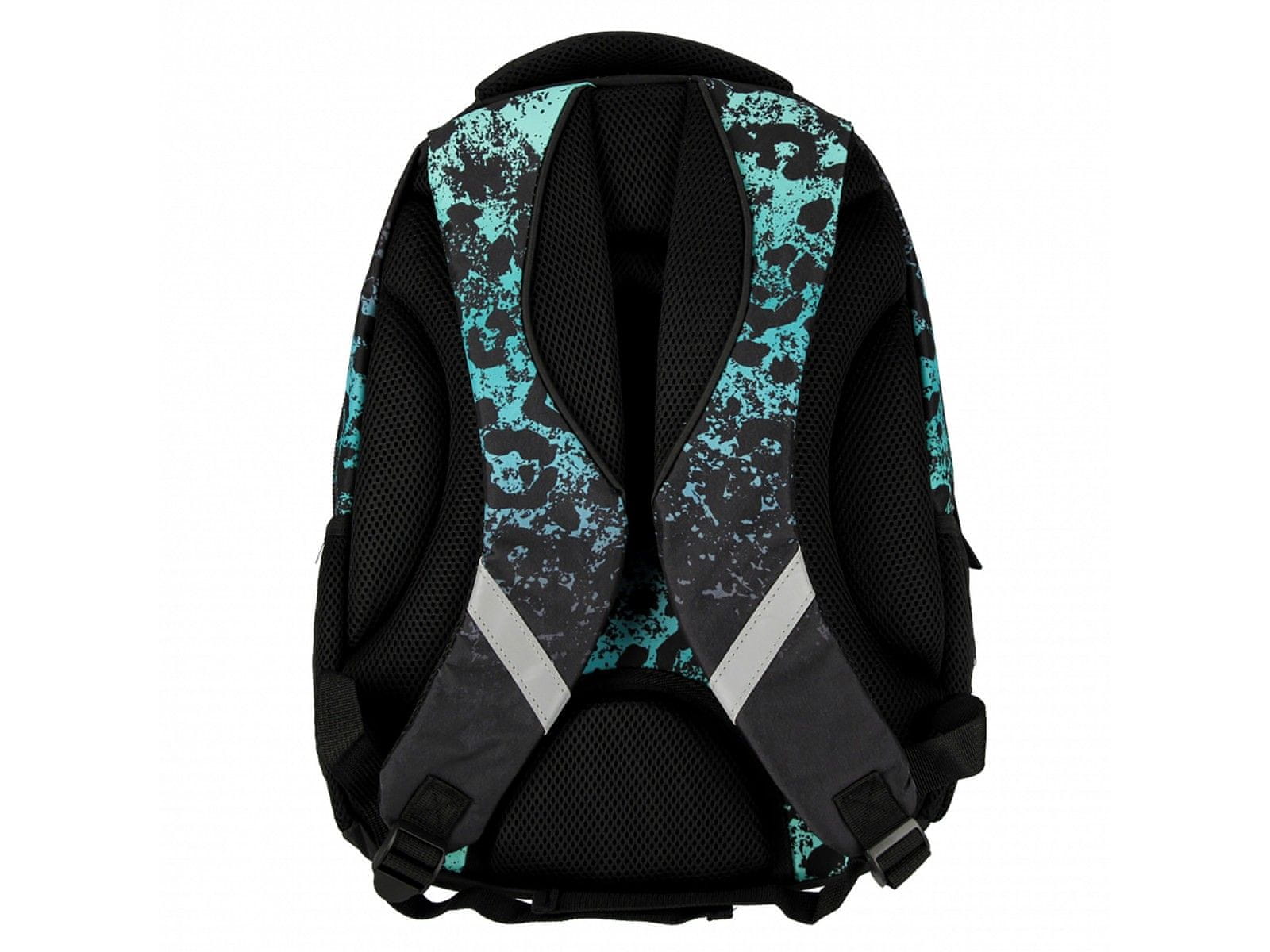 Črn mladinski nahrbtnik STARPAK z zelenkasto leopardjim vzorcem dimenzij 43×35×21 cm je stilska in funkcionalna izbira za učence.Opremljen je z eno veliko komoro in dvema prostornima sprednjima žepoma, znotraj katerih so organizatorji, ki olajšajo vzdrževanje reda.Poleg tega ima dve stranski, ojačani mrežasti žepi, ki sta idealna za steklenico z napitkom.Nahrbtnik ima vzdržljive zadrge, ergonomski hrbet in naramnice ter sistem prezračevanja za večje udobje pri uporabi.Debele, mehke, nastavljive naramnice zagotavljajo zaščito ramen in možnost prilagoditve višini in telesni zgradbi.Ročaj v notranjosti je ojačan, kar omogoča udobno obešanje nahrbtnika na obešalnik ali nošenje v roki.Dimenzije izdelka: 43×35×21 cm, prostornina 26 l.