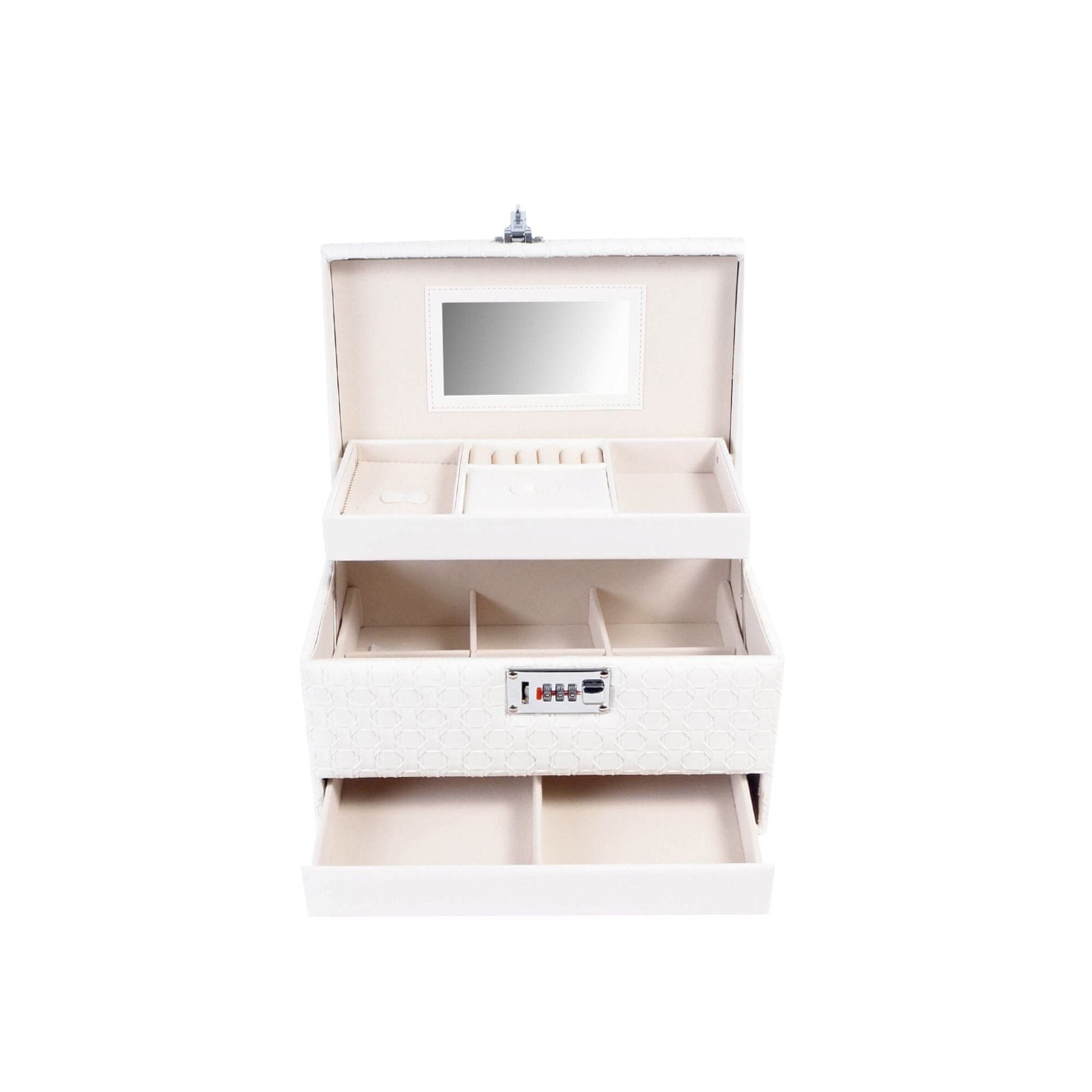 Ena glavnih prednosti te škatlice za nakit je vgrajeno ogledalo, ki vam omogoča hitro in udobno preverjanje svojega videza. Zrcalo je nameščeno na notranji strani pokrova, tako da je vedno pri roki, ko ga potrebujete.
