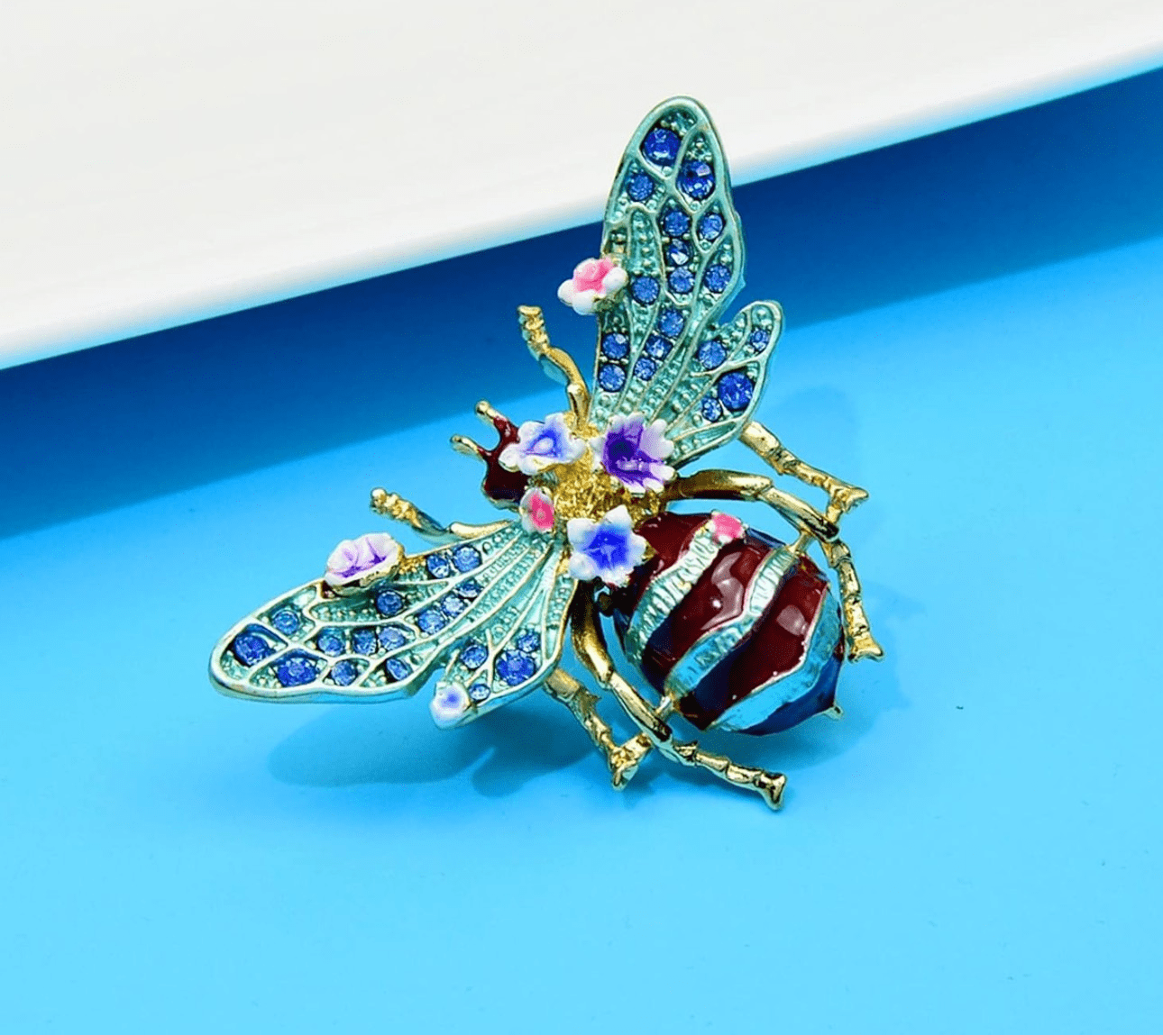 Elegantna zlatna in modra emajlirana broška z motivom čebele je popoln dodatek za vsako žensko, ki ceni stil in edinstvenost.