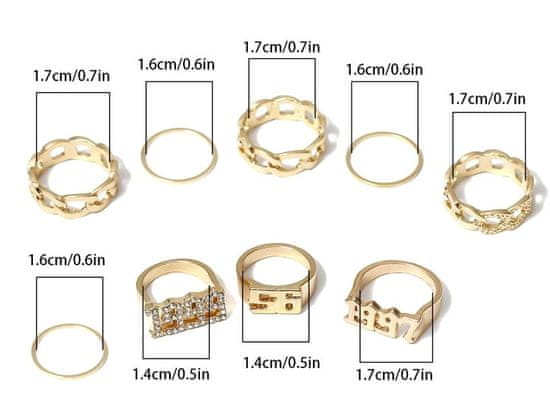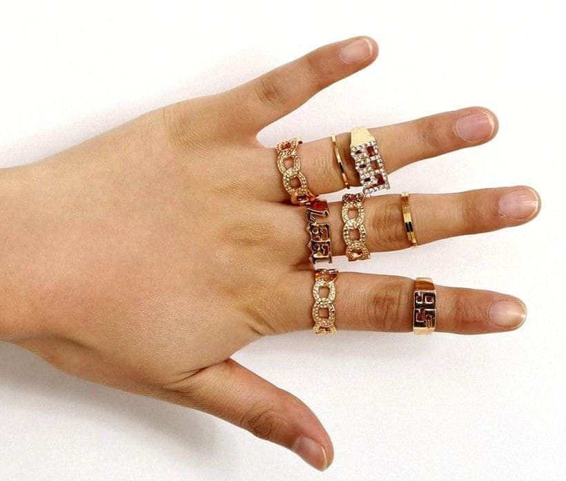 Camerazar Komplet 8 boho prstanov v retro stilu, zlata barva, širina 16-18 mm