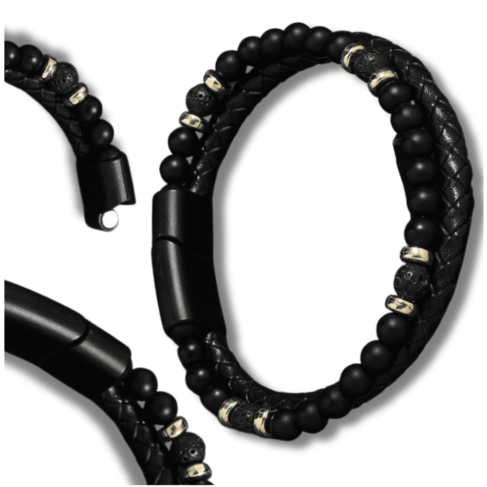 Moška zapestna naramnica združuje klasičen stil z modernim dizajnom, kar jo naredi idealen dodatek za moške, ki cenijo edinstven videz in visoko kakovost. Narejena je iz najkakovostnejše naravne kože in naravnih kamnov, ima črno mat barvo kamnov in elegantne zlate obroče kot okras. Z obsegom 21 cm in širino 1,2 cm se odlično prilagaja vsakemu zapestju, njena magnetska zapirala pa zagotavljajo udobno in varno nošenje.