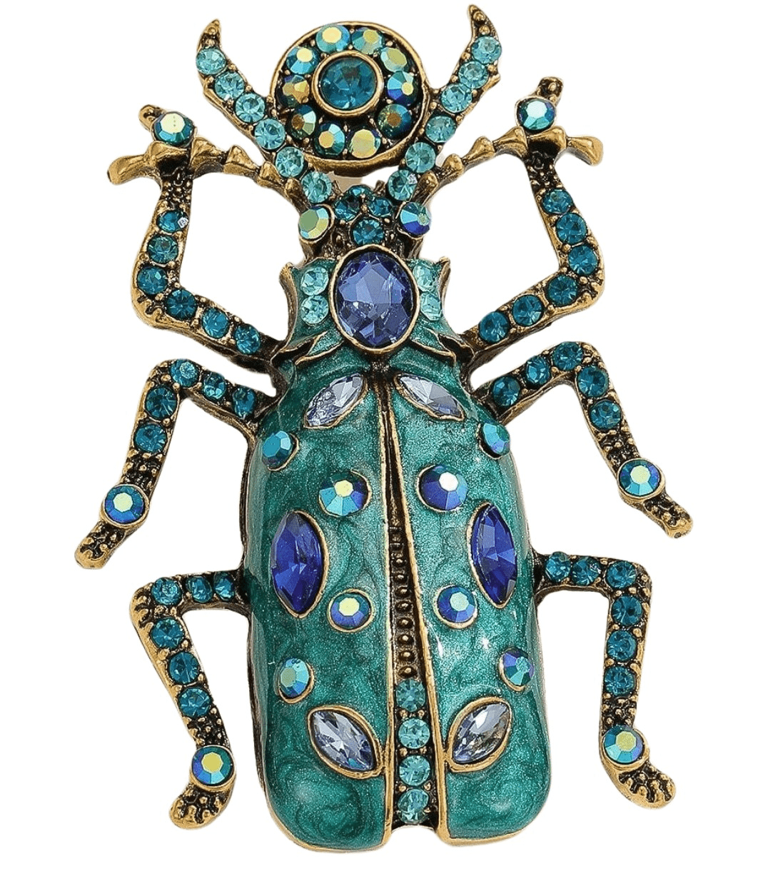 Eleganten emajliran brož v obliki hrošča, okrašen s kristali cirkonov, je popoln dodatek za vsako žensko, ki ceni izvirnost in stil. Narejena iz kakovostne bižuterijske zlitine, brož meri 7,2 cm v višino in 4,8 cm v širino ter zahvaljujoč emajlirani površini v mornarskih odtenkih zelene in modre dodaja vašemu videzu pridih luksuza.