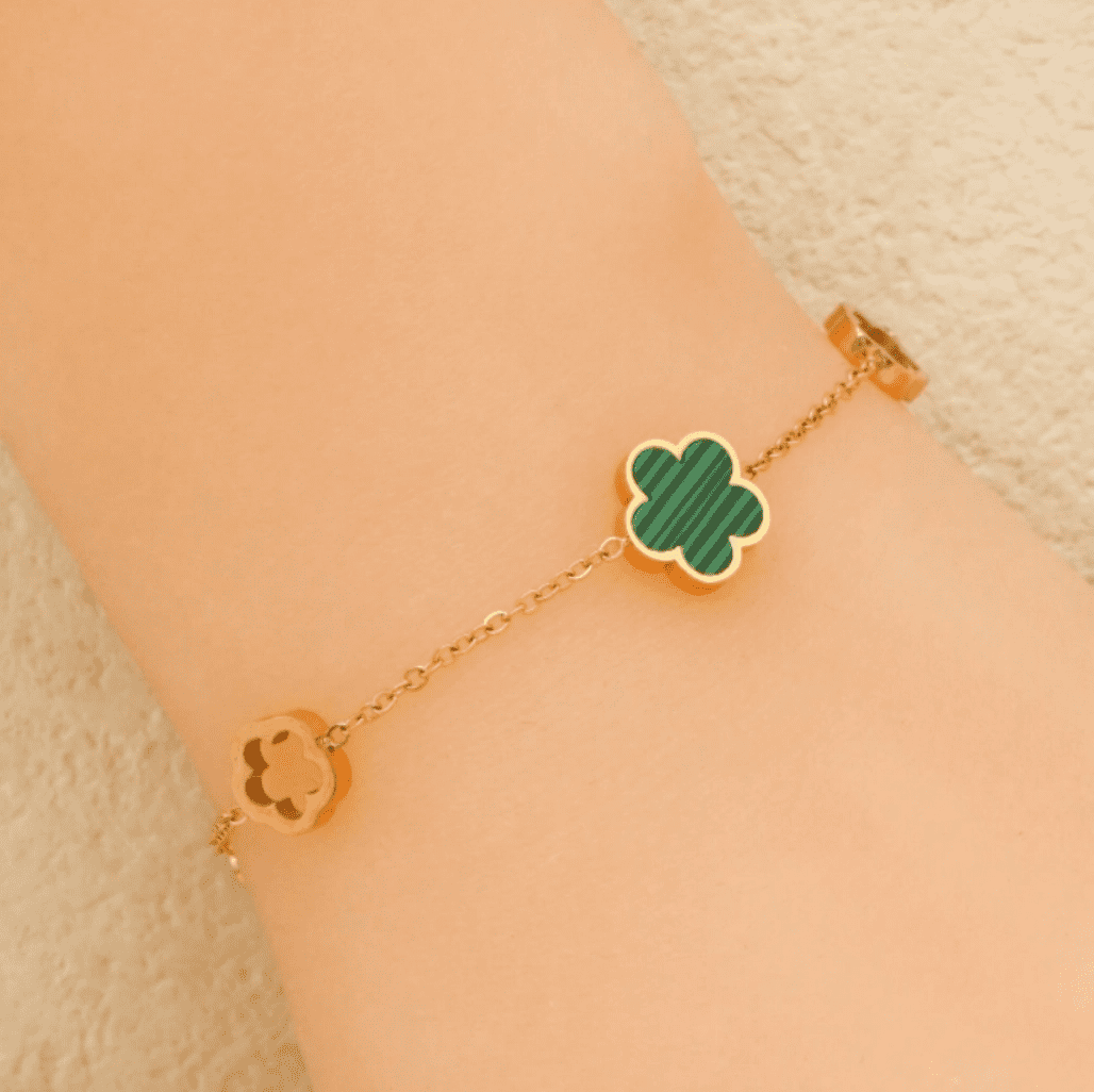 Zlatna zapestnica z nežno zeleno cvetlico je luksuzni kos nakita, ki bo vašo obleko spremenila v nekaj posebnega in vam pri vsakem gibanju dodala samozavest.
