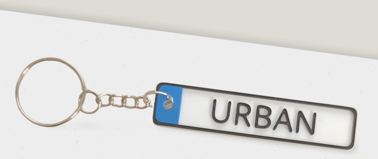 Minimalističen, a izjemno opazen dodatek v obliki evropske registrske tablice. Natančno 3D tiskanje, kovinski obroček za takojšnjo uporabo in popolna ideja za darilo ali osebni stil.