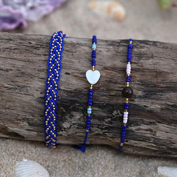 • zapestnica iz perlic z rjavo okroglo perlico, zapestnica iz perlic z belim srčkom in tekstilna zapestnica z vpletenimi majhnimi pozlačenimi perlicami,