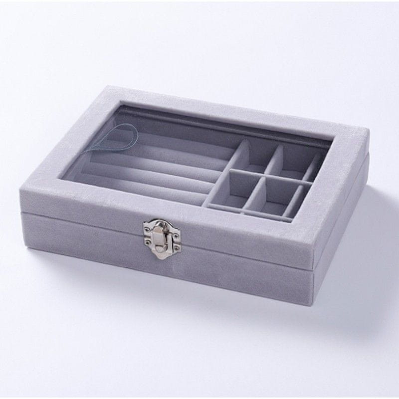Škatla je izdelana iz visokokakovostnih materialov in oblečena v luksuzno sivo velur tkanino, kar ji daje okusno in stilno podobo.