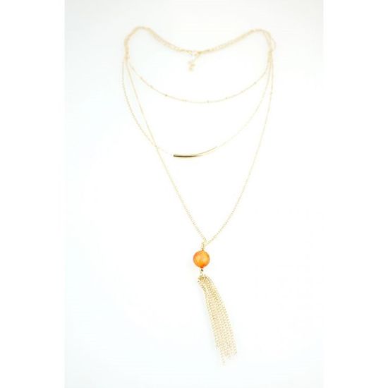 Flamenco Mystique Trojni zlatni necklace s oranžno biserno in visečimi verižicami, dolžina 45 cm