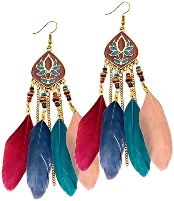 For Fun & Home Dolge Boho Retro Uhani iz Perja, Kov, Dolžina 13 cm - Širina 2,5 cm