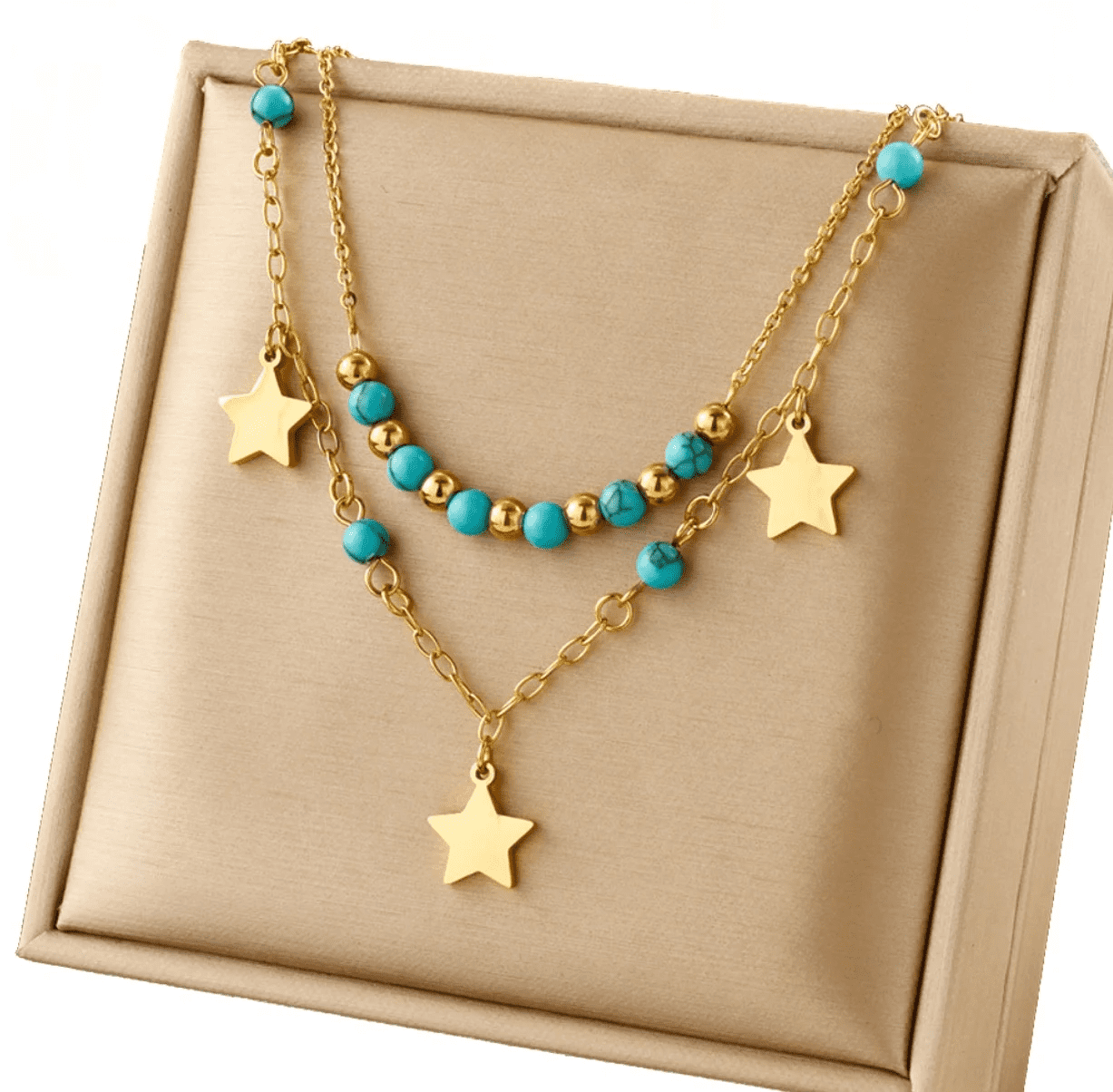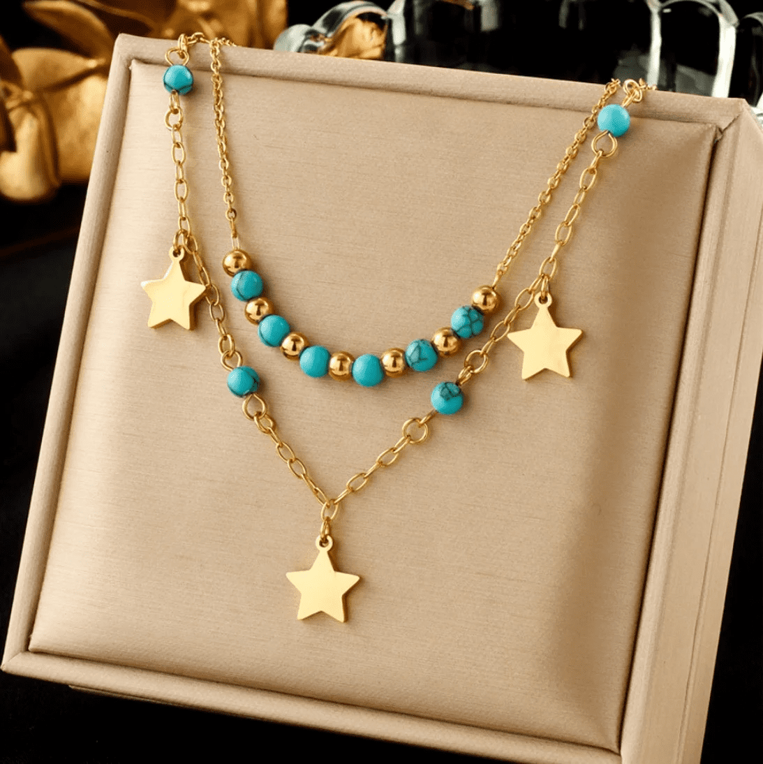 For Fun & Home Dvojni ogrlica iz kirurške jekla 316L, zlata, z modrimi zvezdami in krogci, dolžina 40-44 cm