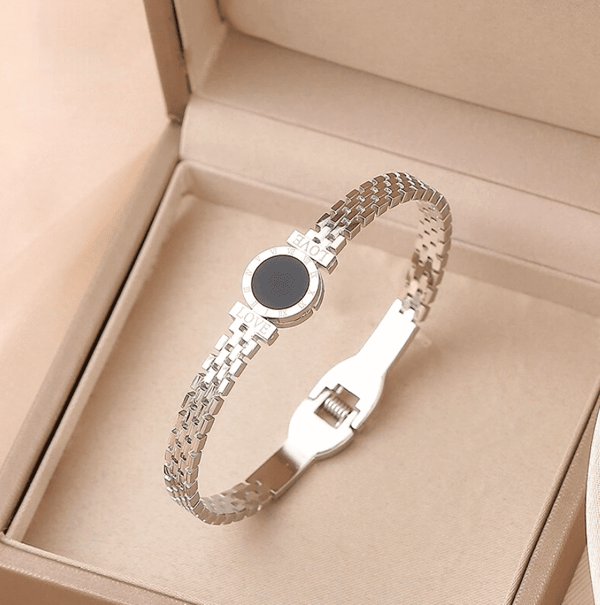 Njen dizajn, navdihnjen z urami, vključuje črn številčnik, obdan z rimskimi številkami in napisi „LOVE“, kar daje zapestnici edinstven in plemenit videz.