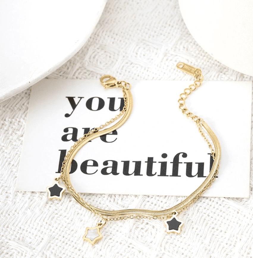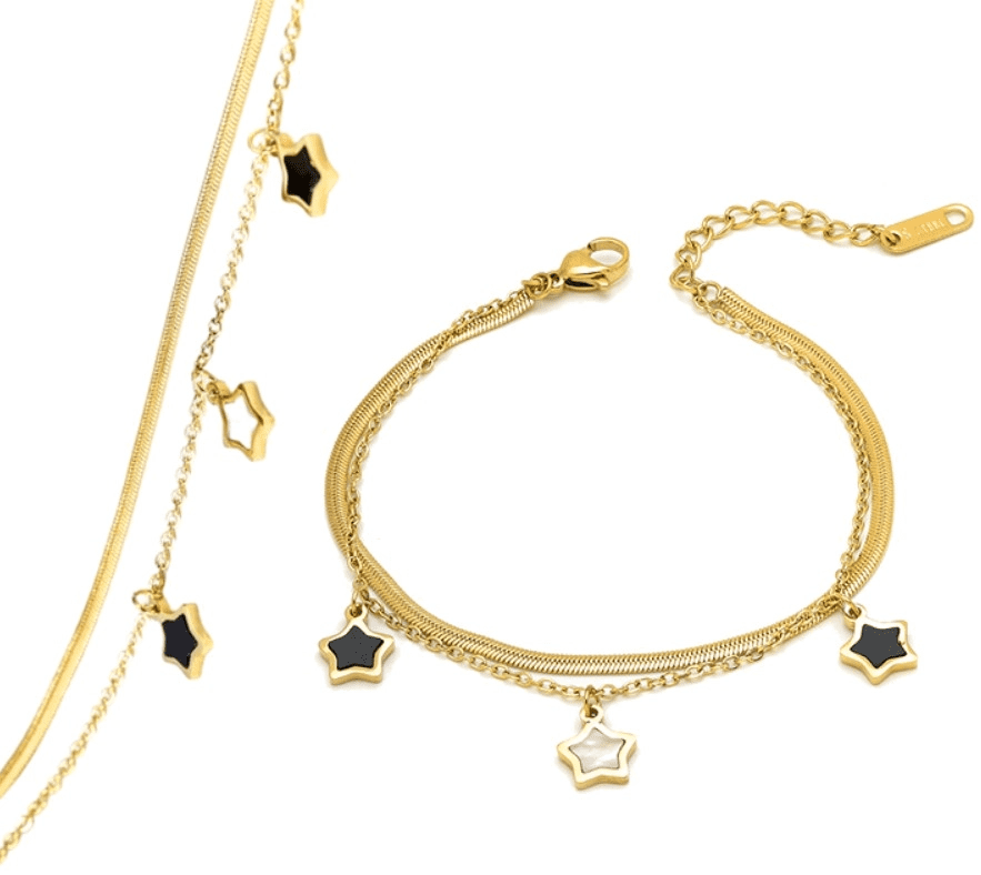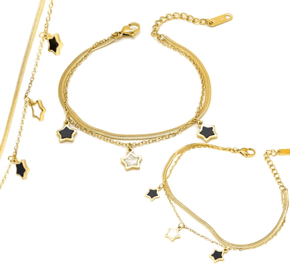 Ta eleganten zlat zlatnik iz kirurškega jekla 316L z zvezdicami je popoln dodatek za vsako priložnost. Njegov minimalisticen dizajn izstopa s kombinacijo gladke verige in klasičnega očkastega stila, prepletenega z zvezdastimi obeski, pri čemer sta dve zvezdici napolnjeni s črno snovjo in ena z belo. Zlati zlatnik je hipoalergen, odporen na vremenske vplive in nekorodirajoč, kar zagotavlja dolgo življenjsko dobo.