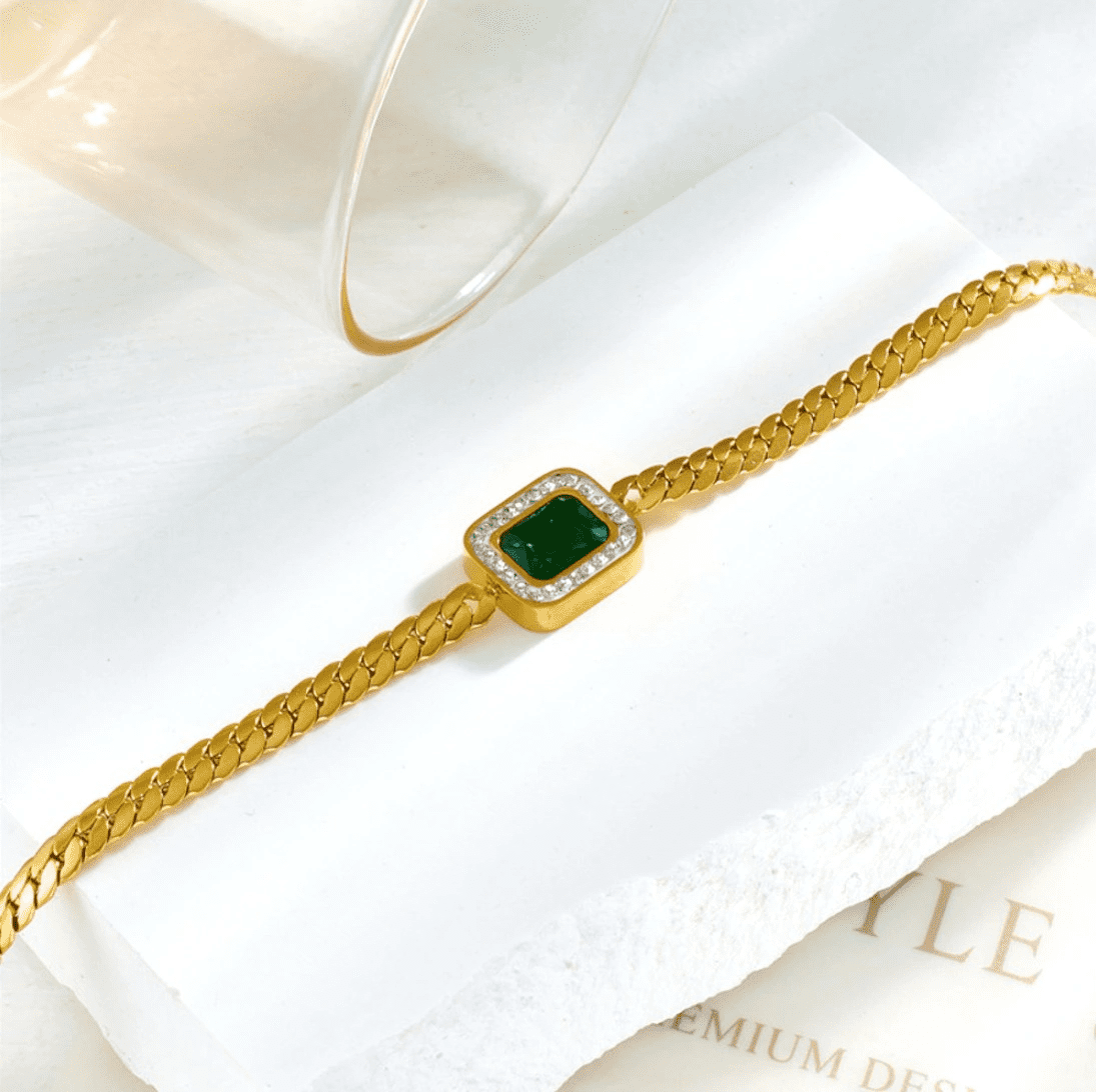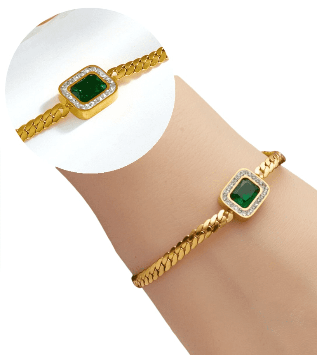 Elegantna zlatna zapestnica iz kirurškega jekla 316L s pozlato 18-karatnega zlata in obeskom z zelenim cirkonom predstavlja idealno izbiro za ženske, ki cenijo kakovostno obdelavo in stilno zasnovo.